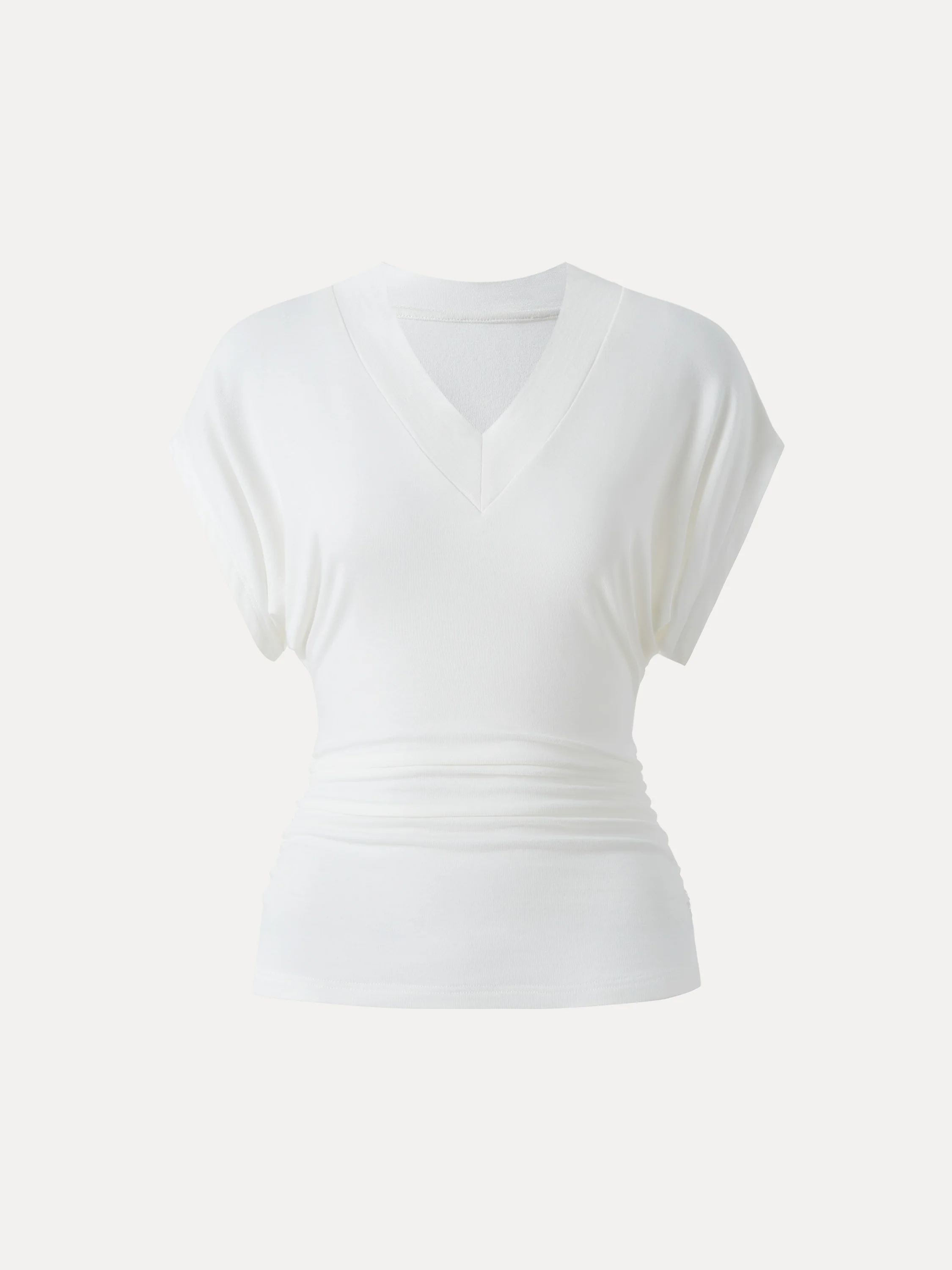 Semi-sheer Lyocell Cashmere Blend V-neck Short Sleeve Side Ruched Tee